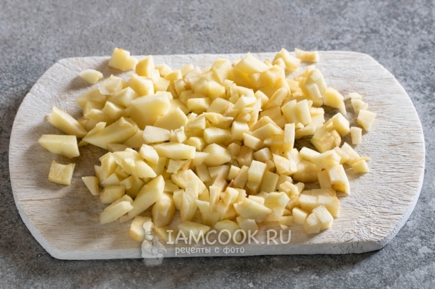 Поближе к концу охлаждения теста чистим яблоко и режем его на мелкие кубики.