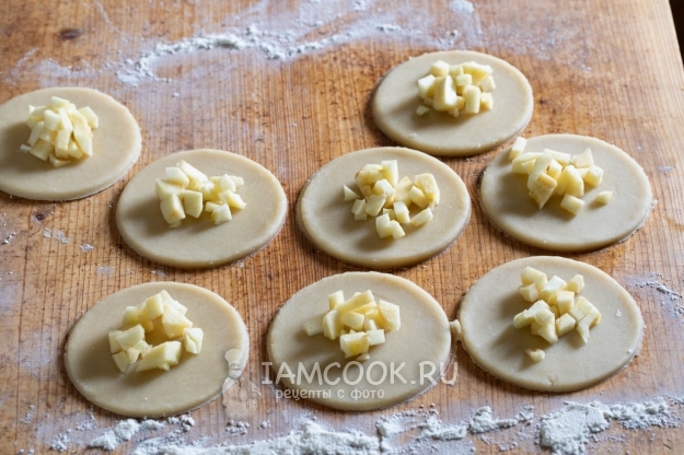 В середину каждого кружочка кладем где-то 1 чайную ложку рубленых яблок.