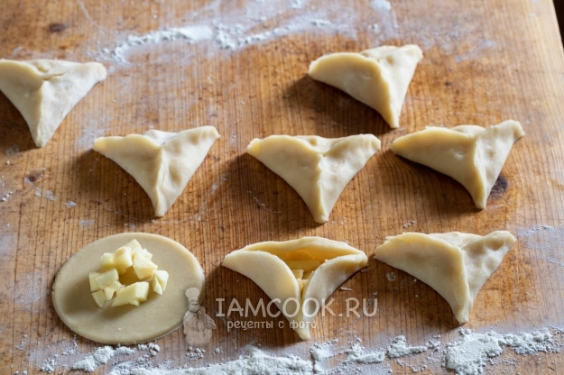 Защипываем края круга в форме трехсторонней пирамидки. Все, были кружочки, стали уголки. С яблоками.