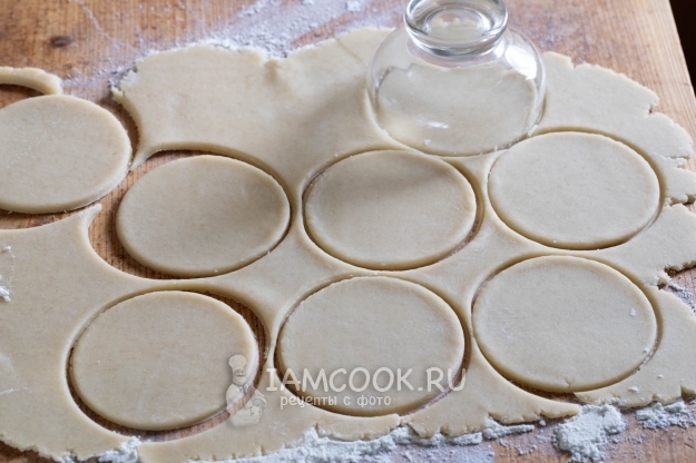 Крупной чашкой или мелкой миской вырезаем кружочки диаметром около 10 см. Да, я не ошиблась, для изготовления печенья уголки с яблоками нужны именно кружочки!