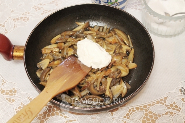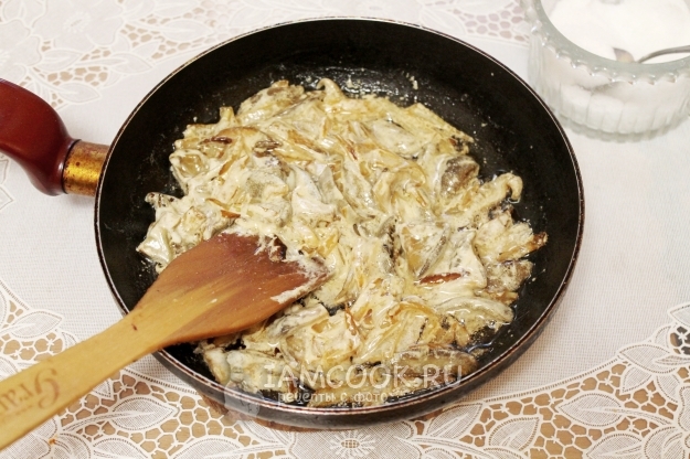 Добавляем сметану. Если она слишком густая, то вливаем немного воды, чтобы получился густой соус.