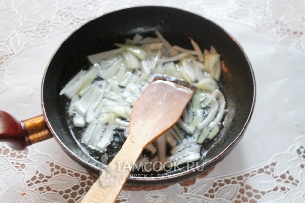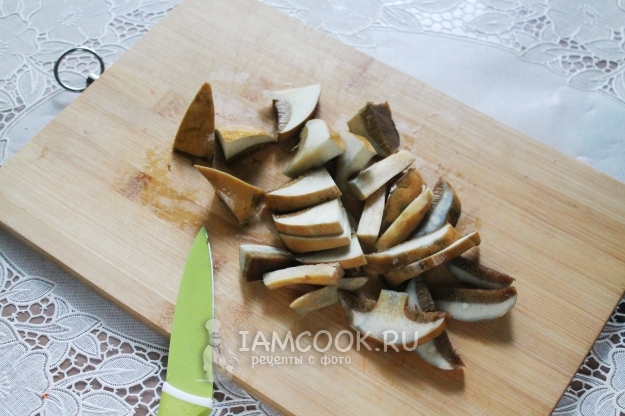 Моховики - очень чистые грибы, поэтому обработка не займет много времени, обычно я их просто быстро промываю губкой под краном. Потом грибочки нарезаю не очень мелкими дольками. Аналогично нарезаю лук.