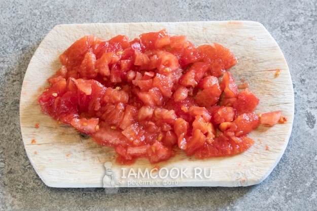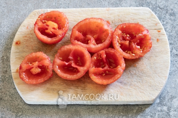 Бланшируем в кипятке томаты 3 минуты, скатываем их холодной водой, удаляем кожицу, режем на половины поперек и удаляем семена.