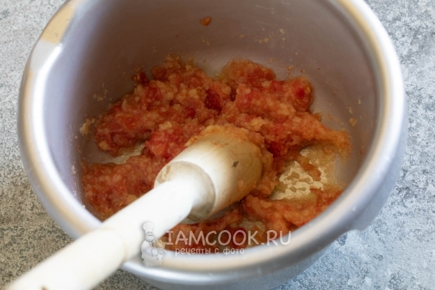 Толчем помидоры вместе с картошкой и чесноком. Без фанатизма, не нужно добиваться гомогенного пюре.