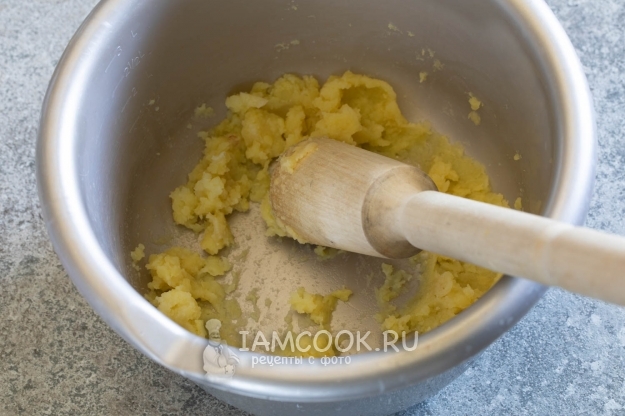 Холодную вареную картошку толчем вместе с чесноком и солью.