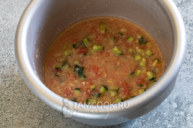 Добавляем к остальным ингредиентам огурец, оливковое масло, уксус и перец, а потом начинаем вмешивать в гаспачо с картошкой воду, вплоть до достижения им желательной для вас консистенции. Я вот остановилась на довольно густой. На это ушло 300 мл воды.