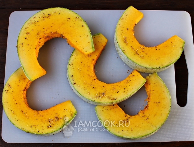 Тыкву моем, разрезаем на 2 или 4 части, зависит от размера тыквы. Нам понадобится примерно четвертая часть тыквы. Удаляем мягкую сердцевину и семечки, кожуру оставляем. Нарезаем тыкву на сегменты толщиной 2-3 см в самой широкой части.