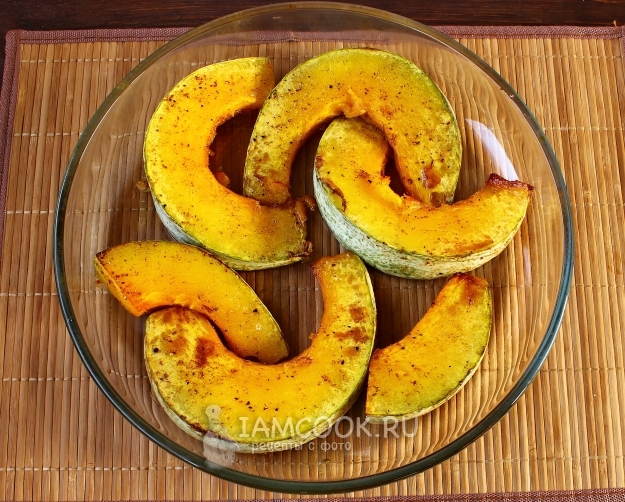 Обжаренную тыкву перекладываем в жаропрочную форму, помещаем в духовой шкаф и запекаем 10-15 минут при температуре 180 градусов. Кусочки тыквы должны стать мягкими и сохранять форму.