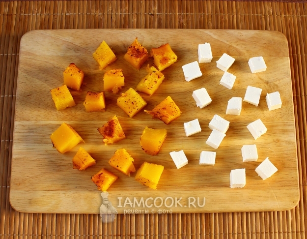 Готовую тыкву остужаем до теплого состояния. Срезаем кожуру, мякоть нарезаем небольшими кусочками. Брынзу нарезаем небольшими кубиками.