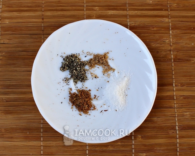 В небольшую пиалу или тарелку кладем приправы: зиру, соль, перец и кориандр. Перемешиваем.
