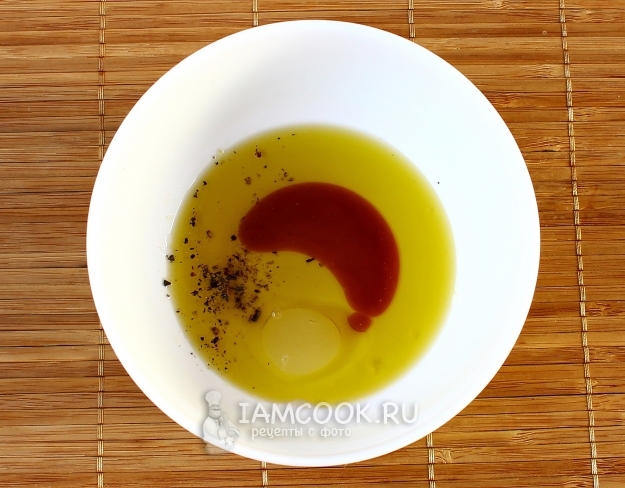Готовим заправку. Для этого в небольшой миске смешиваем составляющие: мед, сок лимона, оливковое масло, перец и соль. Взбиваем их до однородности.