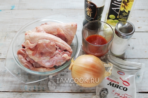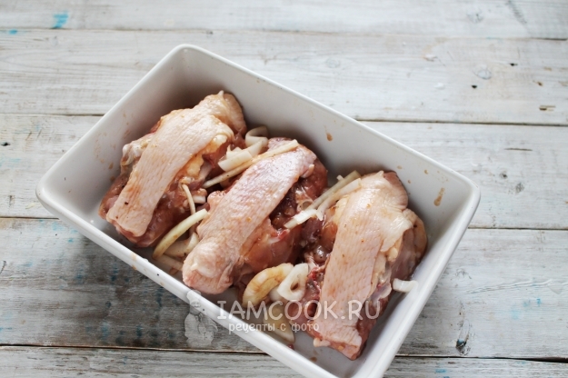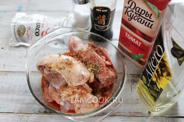 Куриные спинки сложите в кастрюлю, добавьте томатный сок, соевый соус (1 ст.л.), соль и пряности для мяса. Чуть сбрызните маслом. Оно добавит румяности. Нарежьте крупно лук и тоже добавьте в маринад. Перемешайте все и поставьте в холодильник (от 15 минут до нескольких часов, в зависимости от времени приготовления).