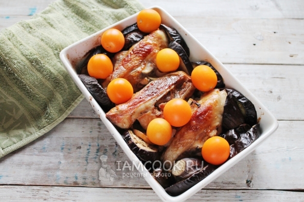 Выньте блюдо из духовки, слейте вытопившийся жир, а сверху разместите помидорки черри, проткнув их зубочисткой (а то будут лопаться и брызгаться). Верните еще на 10 минут в духовку.