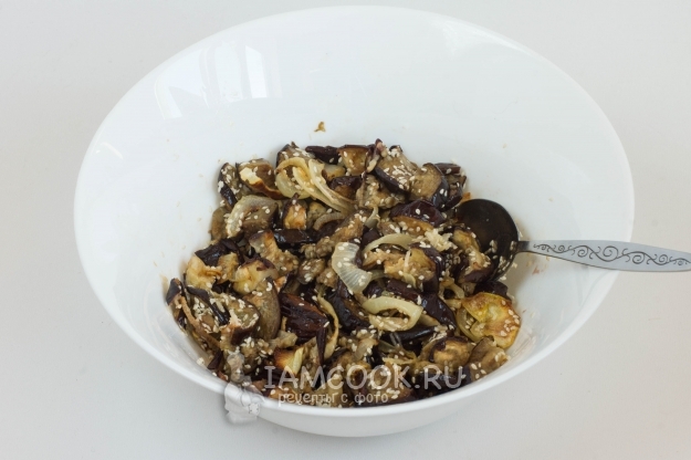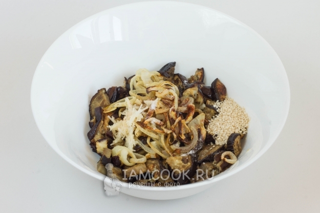 На том же противне или в той же форме, добавив немного растительного масла, запеките при 180 градусах очищенный и нарезанный полукольцами лук. Периодически лук нужно помешивать. Готовый лук добавьте к баклажанам. Положите в миску к овощам соус Наршараб, семена кунжута, мелкую соль, очищенный и измельченный чеснок.