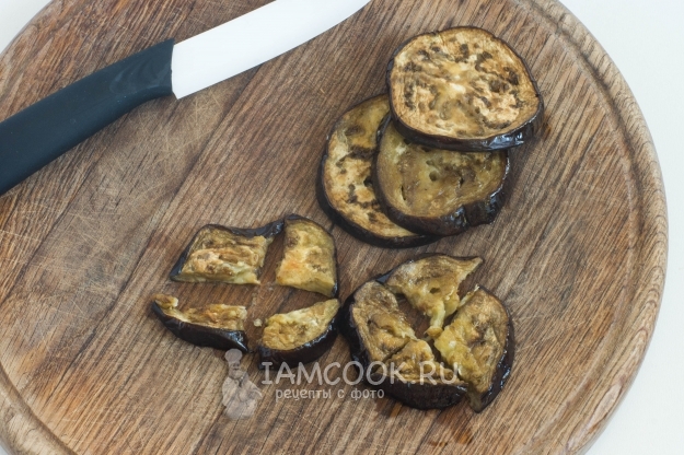 Каждый готовый кружочек разрежьте на 4-6 частей. Сложите измельченные запеченные баклажаны в миску.