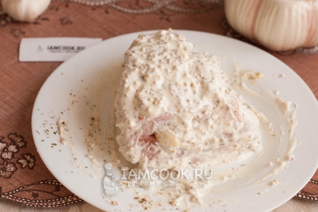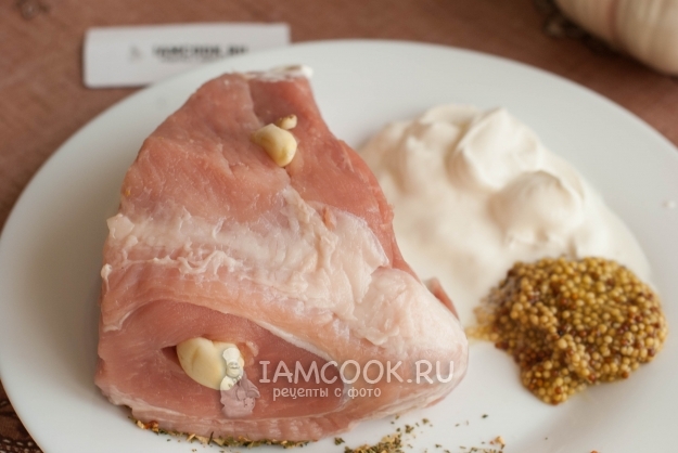 Затем натереть всю лопатку специями, сметаной и горчицей. Посолить и поперчить.