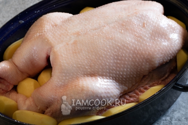 Поверх картошки укладываем гуся грудкой вверх, спинкой - вниз. Обкладываем его картошкой с боков, и внутрь тоже пихаем картошку.