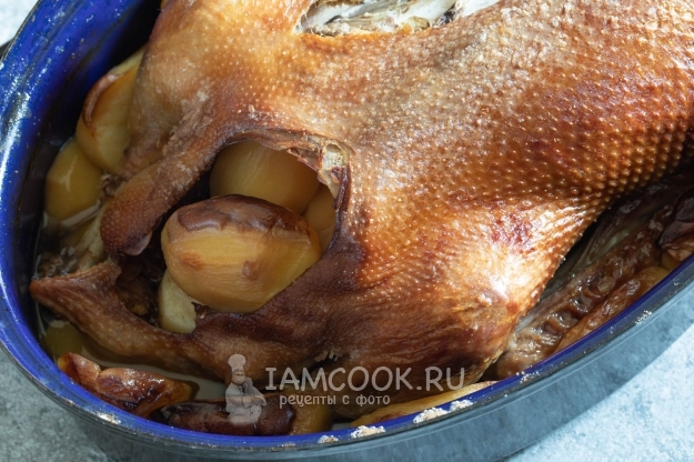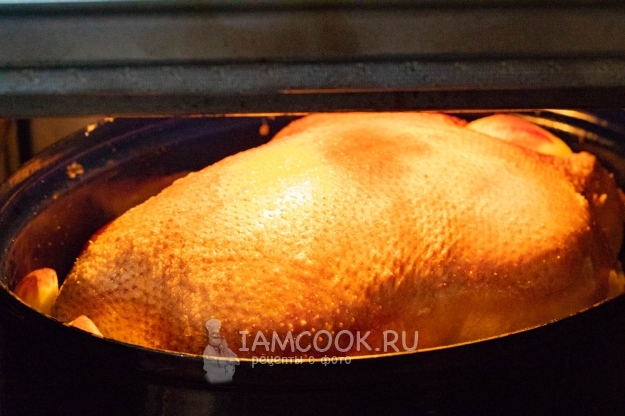 Помещаем гуся в предварительно прогретую до 250°С духовку и запекаем с циркуляцией воздуха около 20 минут до легкой румяности с открытой крышкой гусятницы.