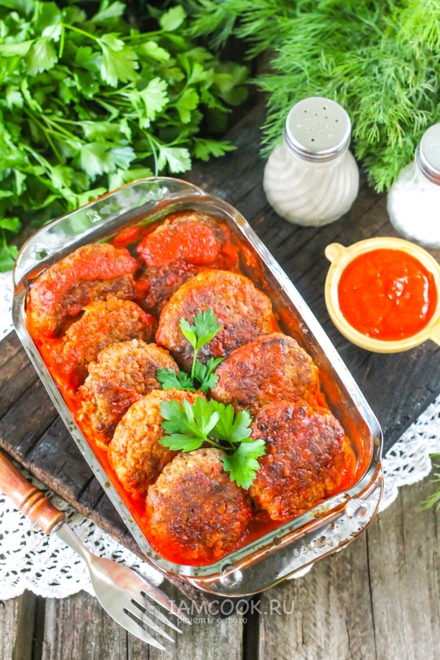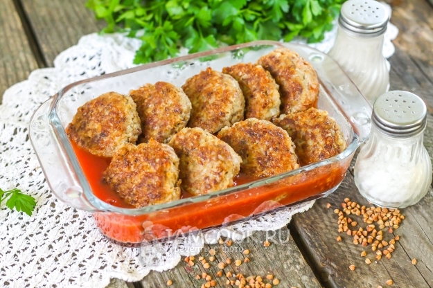 Выложите в соус обжаренные гречаники. Поместите гречаники в томатном соусе в духовку и запекайте при 200°С примерно 15-20 минут.