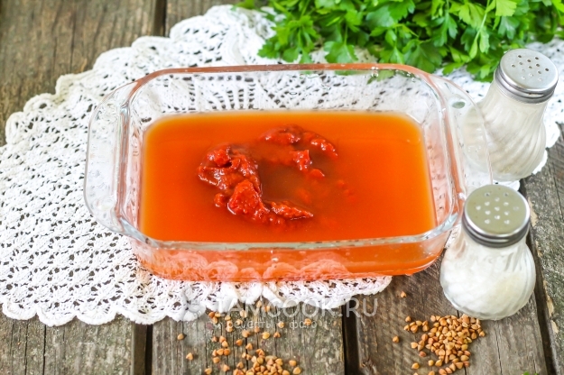В форме для запекания соедините томатную пасту, 100 мл горячей воды, соль и сахар, размешайте.