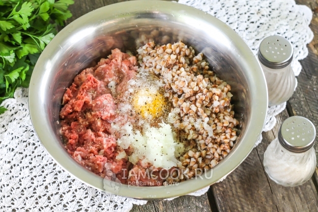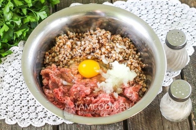 Пересыпьте отварную гречку в глубокую емкость, добавьте мясной фарш, куриное яйцо. Очистите репчатый лук от кожуры, промойте и натрите на терке с мелкими ячейками.
