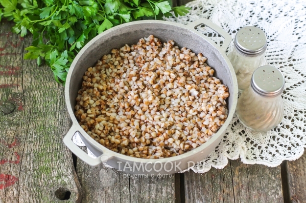 Гречневую крупу переберите, удаляя черные зернышки, промойте в воде. Отварите в казане или сотейнике в течение 12-15 минут с момента закипания жидкости. Затем накройте емкость крышкой, выключите нагрев и дайте пропариться около 5 минут - крупа втянет оставшуюся жидкость.