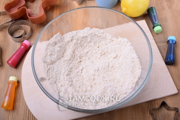 Быстро разотрем пальцами масло с мучной смесью, чтобы получилась мелкая крошка, без крупных кусочков масла. Добавим сахарную пудру и перемешаем пальцами.