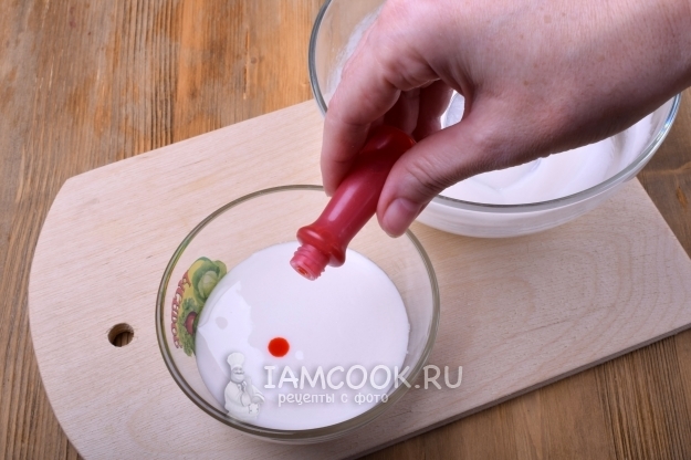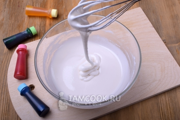 Сначала у глазури будет неприглядный цвет, но постепенно она станет глянцевой и белоснежной. По густоте: глазурь должна лентой стекать с венчика, оставляя след на поверхности. Оставим глазурь на 10-15 минут настояться, а затем раскрасим ее пищевыми красителями.