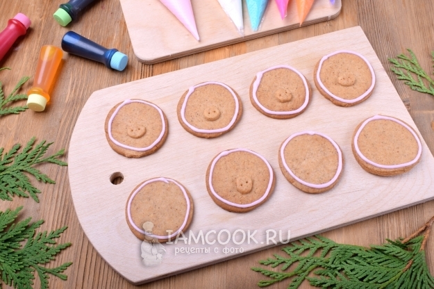 Начнем колдовать! Сначала нарисуем окантовку у каждого печенья и дадим глазури застыть. Такая граница не позволит глазури растечься за края печенья. Много времени для застывания не понадобится, уже через 5-10 минут можно будет двигаться дальше.