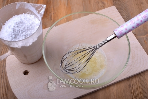 В процессе перемешивания добавляем порциями сахарную пудру. Каждую следующую порцию пудры нужно полностью смешать с белком.