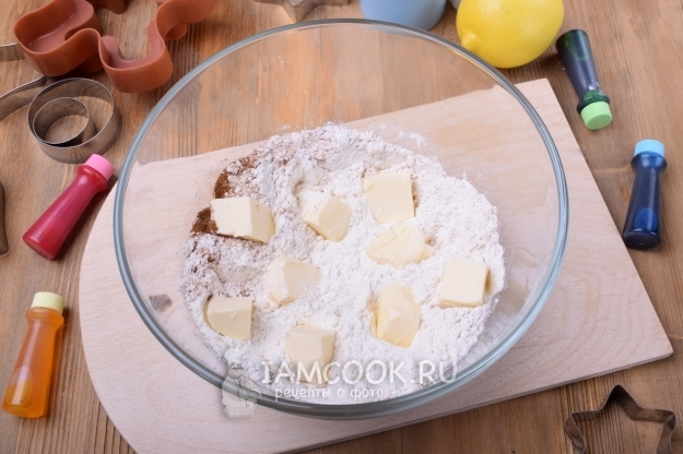 Начнем с теста: в глубокую миску просеем муку, соль, соду и пряности, добавим кубики охлажденного сливочного масла.