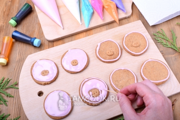 Теперь можно заполнить печенье основным цветом, распределяя глазурь зубочисткой, чтобы она равномерно распределилась на поверхности печенья. Дадим глазури застыть перед нанесением завершающих штрихов разноцветной глазурью.