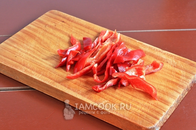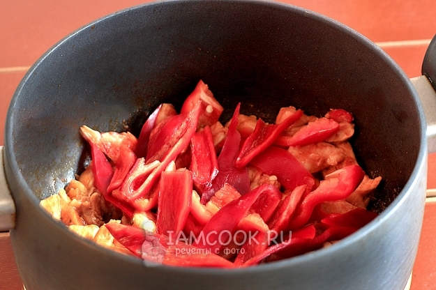 Далее добавьте сладкий перец и держите на огне три минуты при постоянном и активном помешивании. Перец должен оставаться слегка "аль денте".