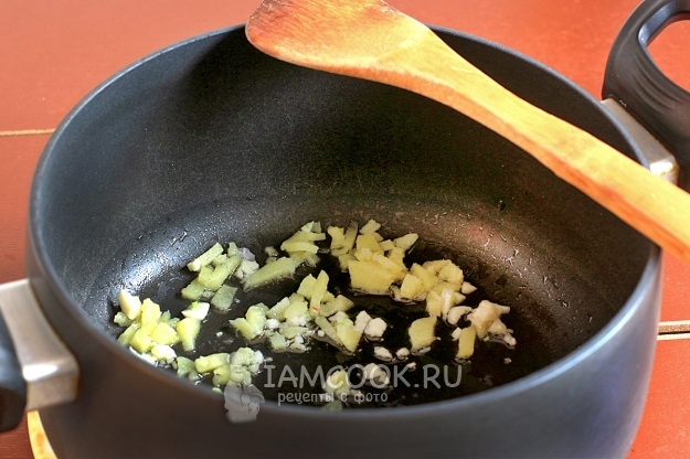 В сковороде разогрейте кунжутное масло и обжарьте тертый имбирь и чеснок до появления стойкого аромата. Не допускайте, чтобы чеснок начал гореть. Кунжутное масло можно заменить обычным растительным, но кунжутное все же предпочтительнее.