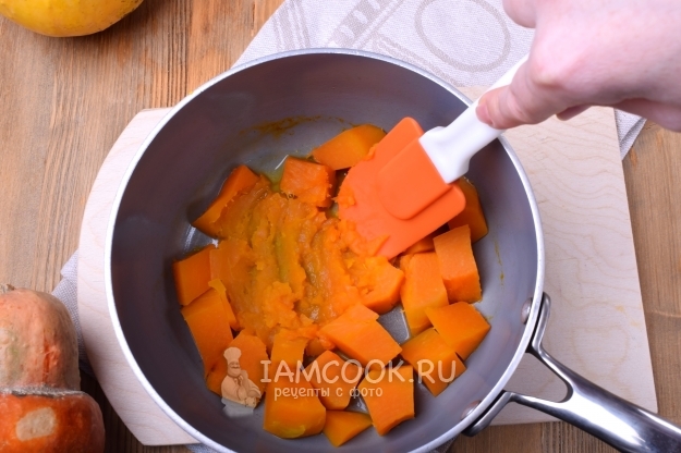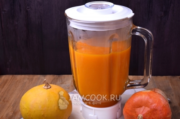 К этому времени тыква приготовилась и из нее легко можно сделать пюре лопаточкой. Не нужно добиваться однородности, блендер всю работу сделает за нас.