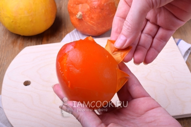 Пока готовится тыква, подготовим хурму: снимем с нее тонкую кожицу, чтобы смузи получился нежным и однородным, затем удалим косточки из плода.