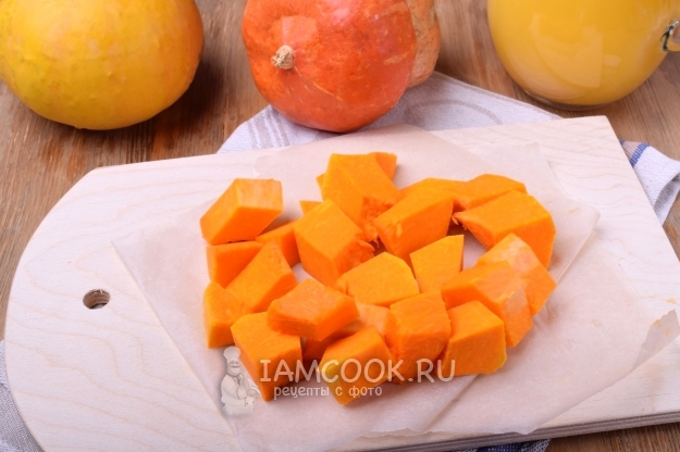 Приготовим тыквенное пюре: мякоть тыквы нарежем на произвольные кусочки, переложим в сотейник, добавим 2-3 ст.л. апельсинового сока и будем тушить под крышкой до мягкости (около 15 минут).