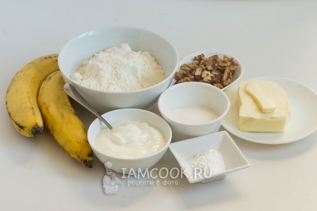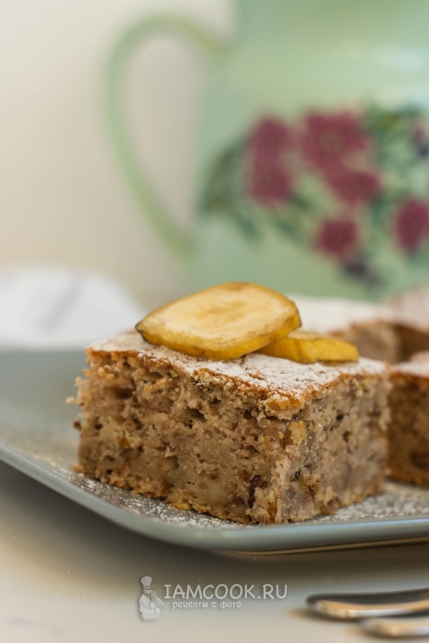 По структуре банановый кекс с грецкими орехами получается в меру плотным, мягким.