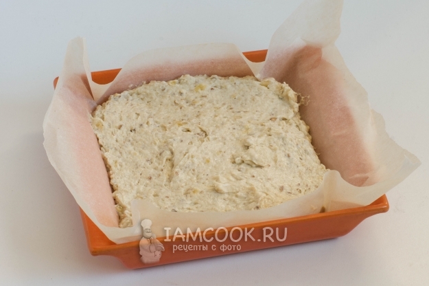 Перемешайте тесто до однородного состояния, выложите в форму, застеленную пергаментной бумагой.