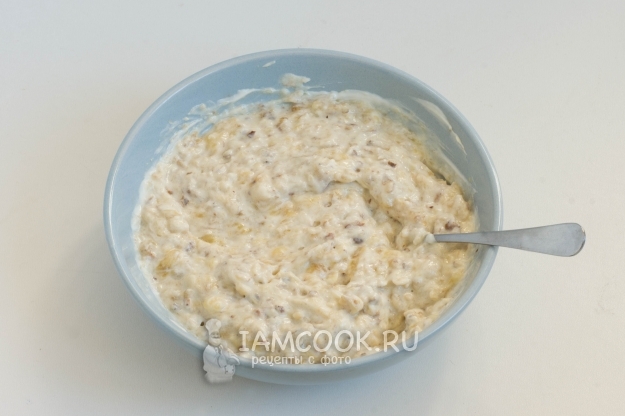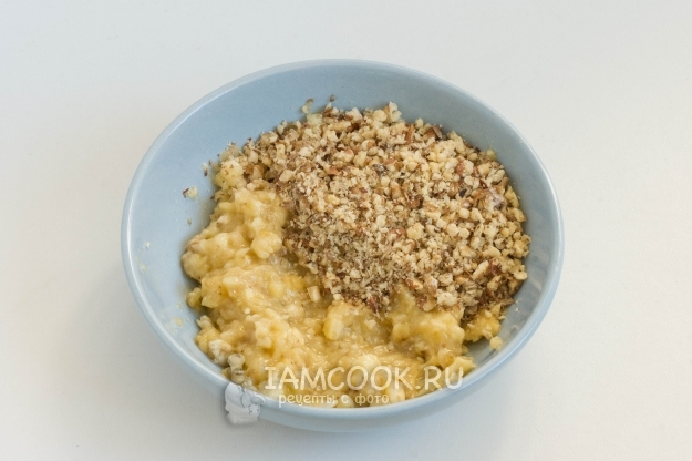 Бананы почистите и разомните в пюре. Добавьте рубленые грецкие орехи. Перемешайте.
