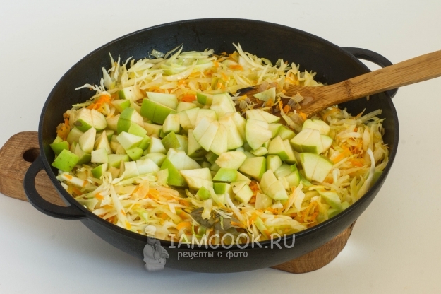 Добавьте яблоки, нарезанные кубиками или соломкой (семена удалите). Посолите. Перемешайте и на слабом огне тушите около получаса.