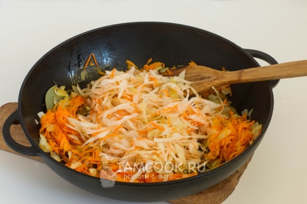 Добавьте пряности, квашеную капусту. Обжаривайте 5 минут на среднем огне.