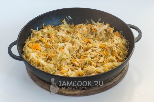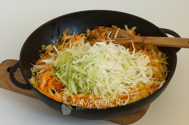 Добавьте в жаровню нашинкованную белокочанную капусту. Перемешайте, обжаривайте еще 5 минут.