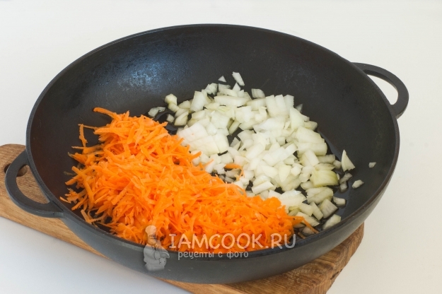 На большой жаровне или сковородке разогрейте растительное масло, выложите лук, нарезанный кубиками, и морковь, натертую на крупной терке. Слегка обжарьте, помешивая.