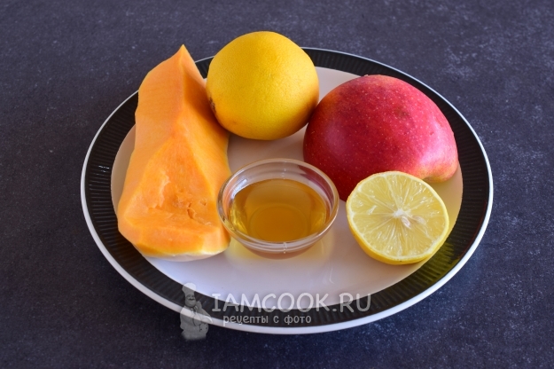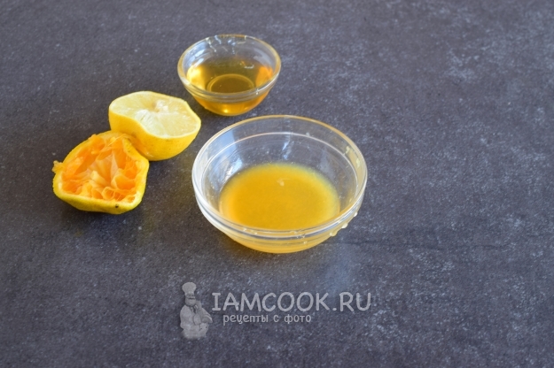 В пиалке смешать мед, сок лимона и сок, выжатый из половинки апельсина.