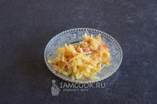 Яблоко лучше взять красное, сладкое, также натереть яблоко вместе с кожурой на средней терке, удалив предварительно семенную коробочку.