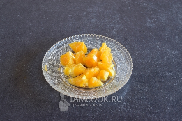 Половину апельсина отложить в сторону в кожуре. Со второй половины апельсина снять кожуру и нарезать мякоть небольшими дольками или кусочками.