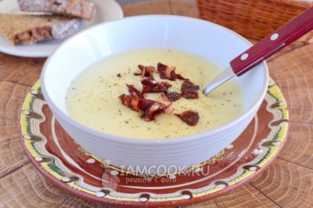 На стол картофельный суп-пюре на сливках подать порционно, украсив кусочками хрустящего бекона.