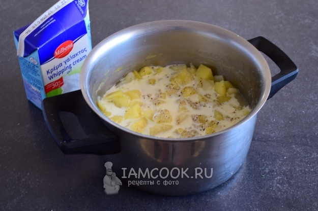 Через 20 минут влить в суп сливки, прогреть суп 2-3 минуты, но не дать ему закипеть.