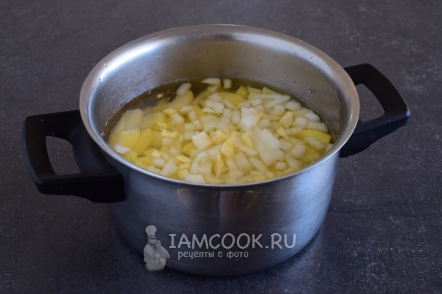 В кастрюлю выложить картофель, лук и чеснок. Залить овощи 1,5 л воды. Варить суп 20 минут после закипания воды, до мягкости овощей.